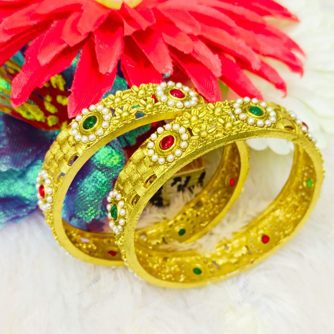 This set of bangles is made of premium gold plating and features a variety of colorful designs with small pearls. It is a fun and festive set that is perfect for special occasions.