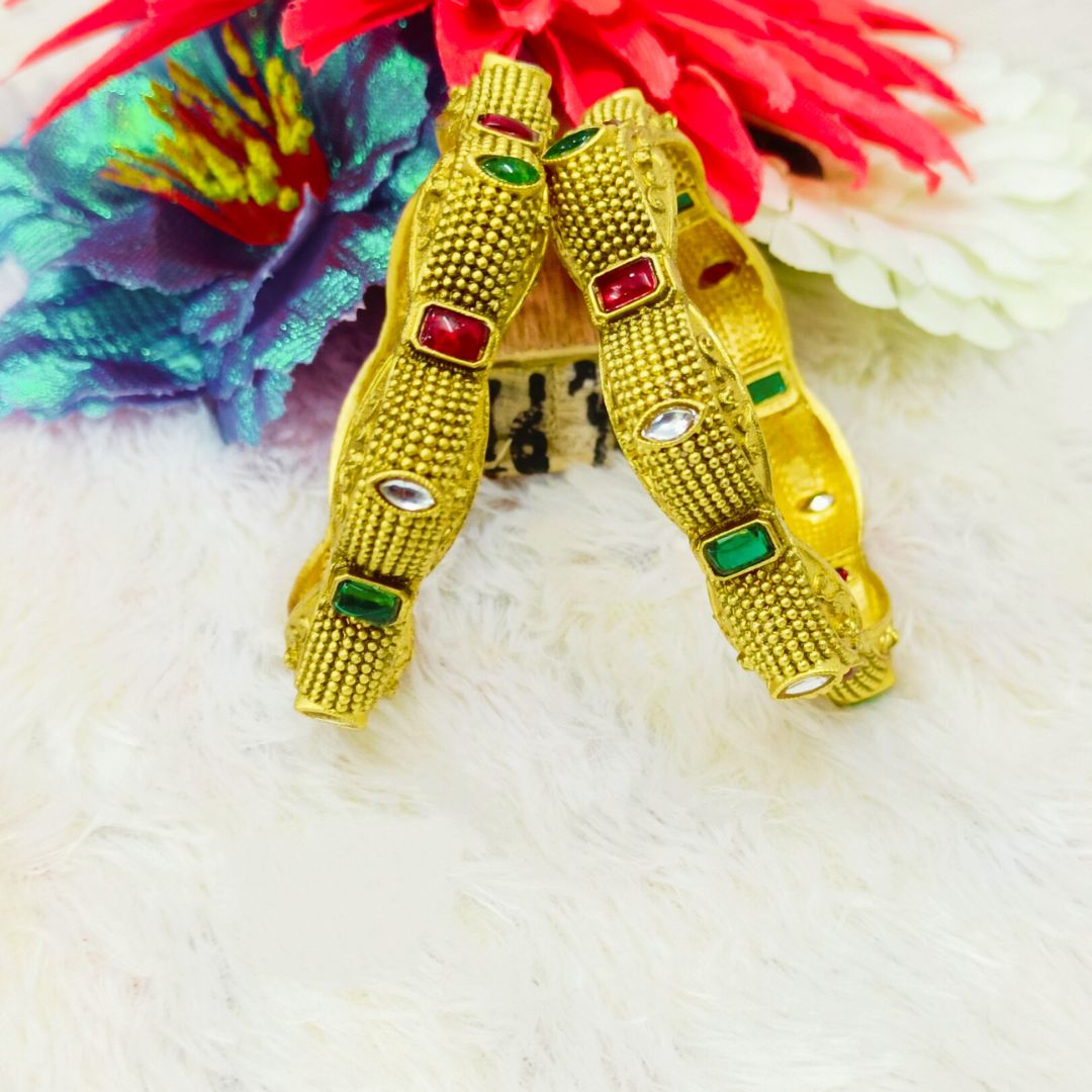 Rajwadi Kundan Designer Gold Plated Bangles. The bangles may be decorated with intricate floral motifs or with individual flower-shaped kundan stones. Rajwadi Kundan Designer Gold Plated Bangles may be decorated with intricate geometric patterns or with individual geometric-shaped kundan stones.