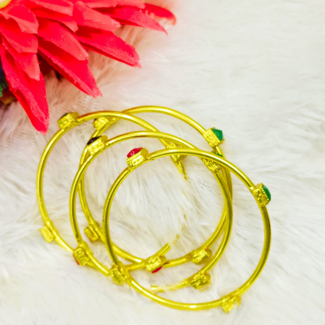 Sober Golden 4 Pieces Bangles with red and green stones are elegant and versatile accessories that can add a touch of traditional charm to your outfit. These bangles are typically made of gold-plated or gold-toned metal, giving them a timeless and sophisticated look.The red and green stones are often used as embellishments to enhance the beauty of the bangles. Red stones, such as rubies or red crystals, symbolize passion and energy, while green stones, like emeralds or green crystals, represent growth and harmony. These stones are usually set into the bangles in intricate patterns or designs, adding a pop of color and sparkle.Sober golden bangles with red and green stones are suitable for various occasions, including weddings, festivals, or formal events. They can complement both traditional and contemporary outfits, making them a versatile accessory choice. The combination of gold with red and green stones creates a balanced and aesthetically pleasing contrast, making these bangles a popular choice in jewelry fashion.